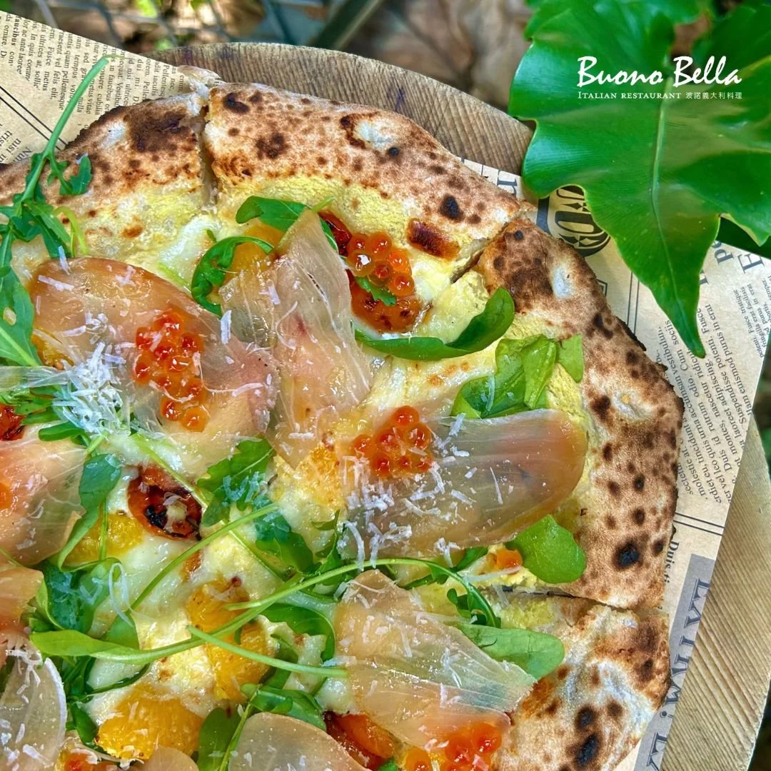 除此之外,主廚以枋寮芒果與Ricotta起司調製披薩底醬,打造出一種清爽果香與奶香交融的風味,讓人一口即感受到南國的陽光。煙燻起司、香吉士、黃番茄與芝麻葉搭配魚火腿交織出的香氣層次,再點綴上鮭魚卵的海味爆點,完成一道融合台灣海洋、義式靈魂與主廚記憶的創新披薩。這道料理不只是餐點,更像是一張載著家鄉故事的船票,把來自屏東的風情,送到新竹波諾的餐桌上。
